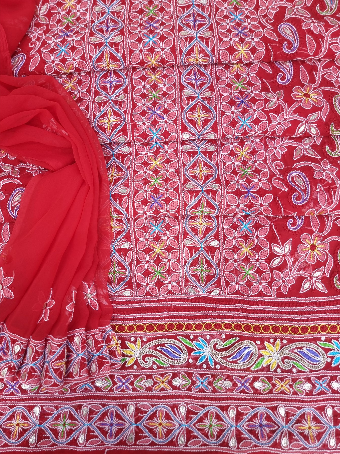 Premium Lucknowi Chikankari Unstitched Dress Material | Hand Embroidered Faux Georgette with Shadow, Murri & Aari Work | Pearl Gota Embellishments