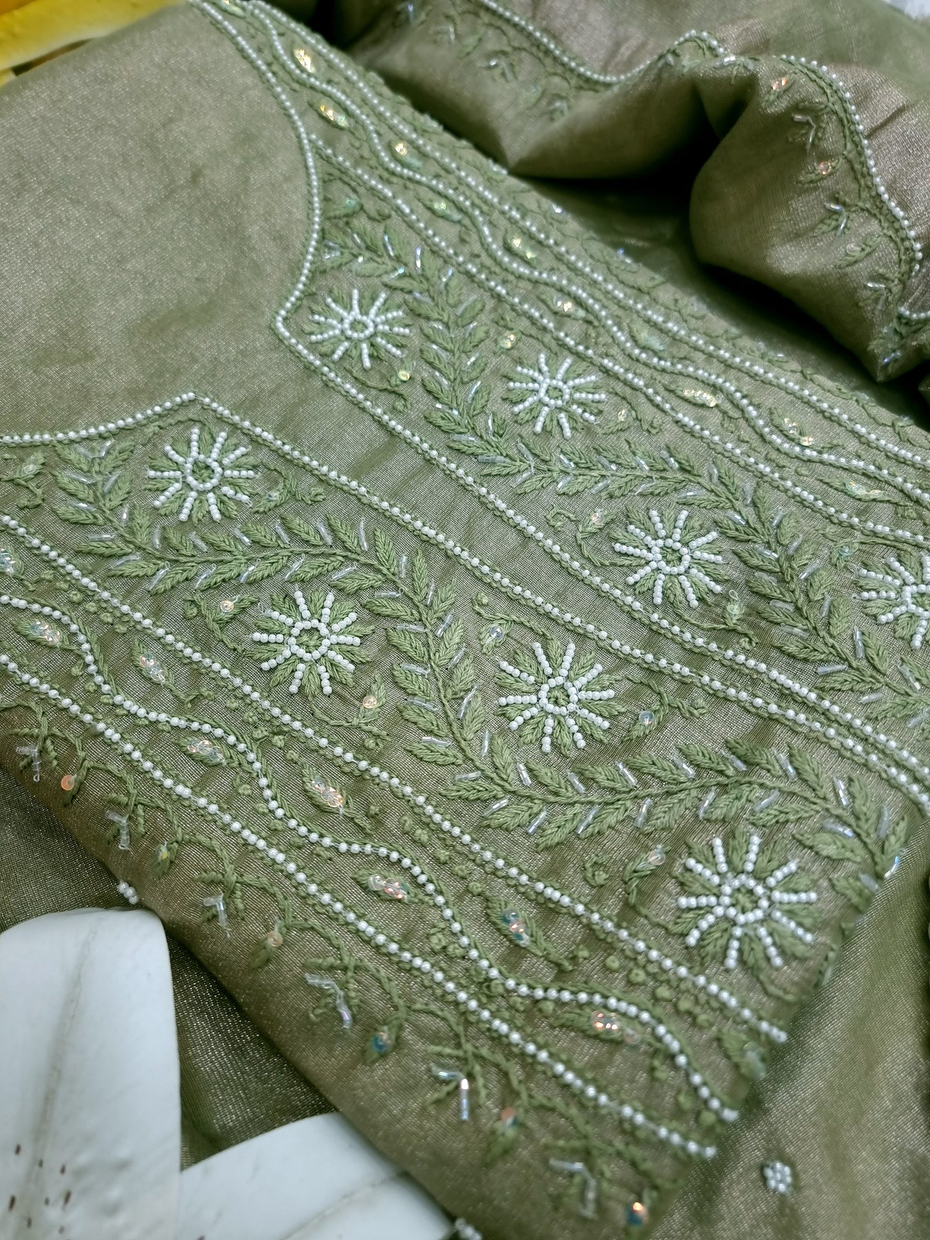 Soft Tissue Chikankari Unstitched Dress Material | 3 Taar Hand Embroidery with Pearl & Cutdana Work + Golden Border Dupatta