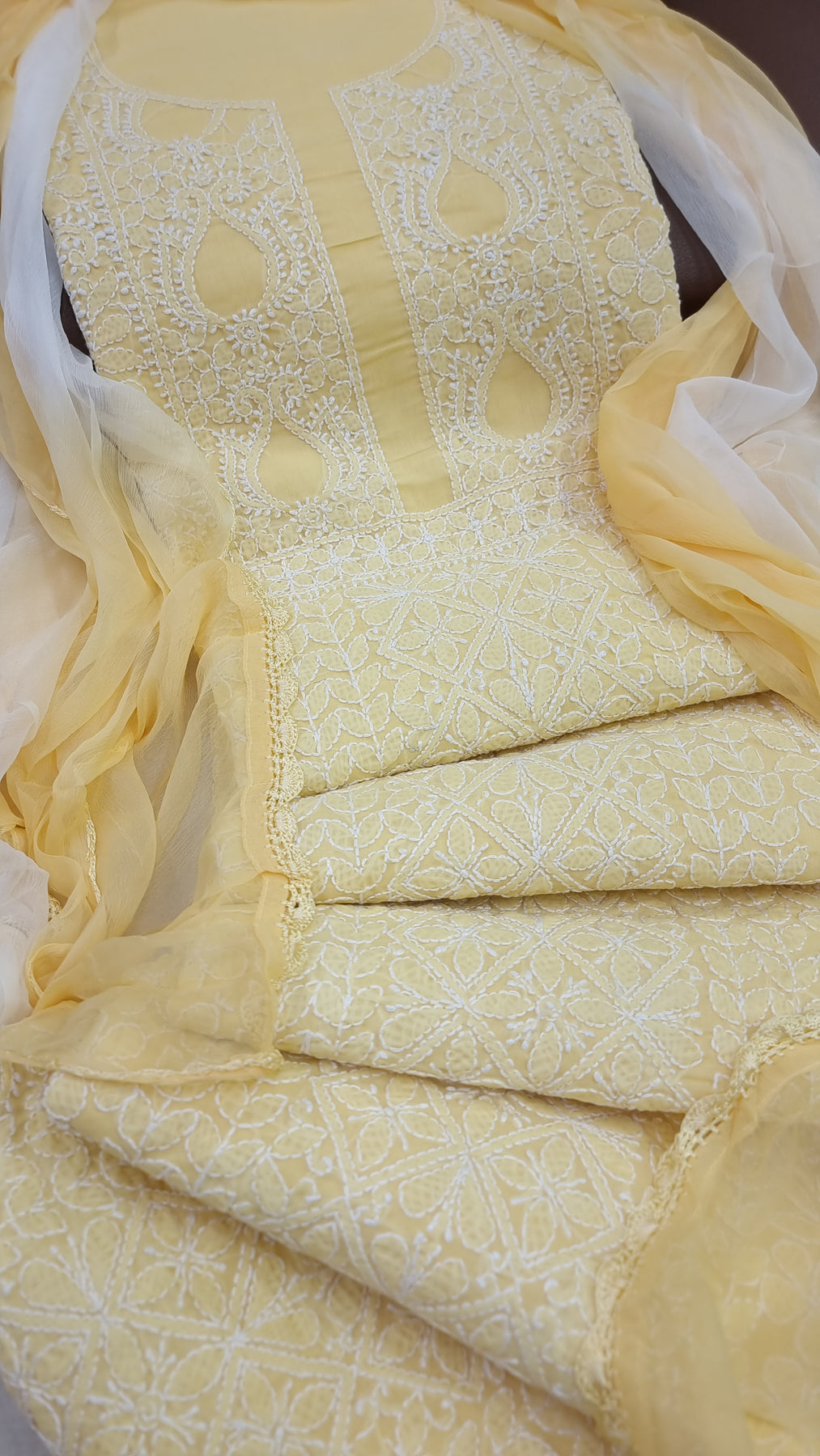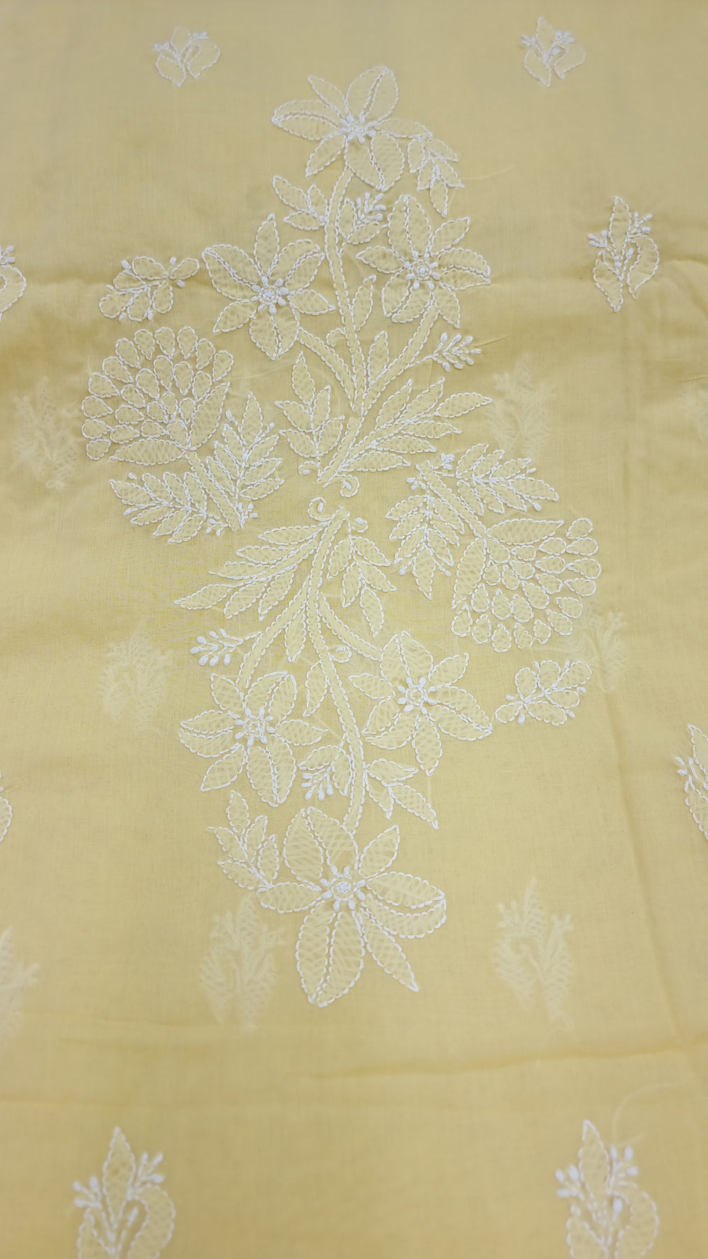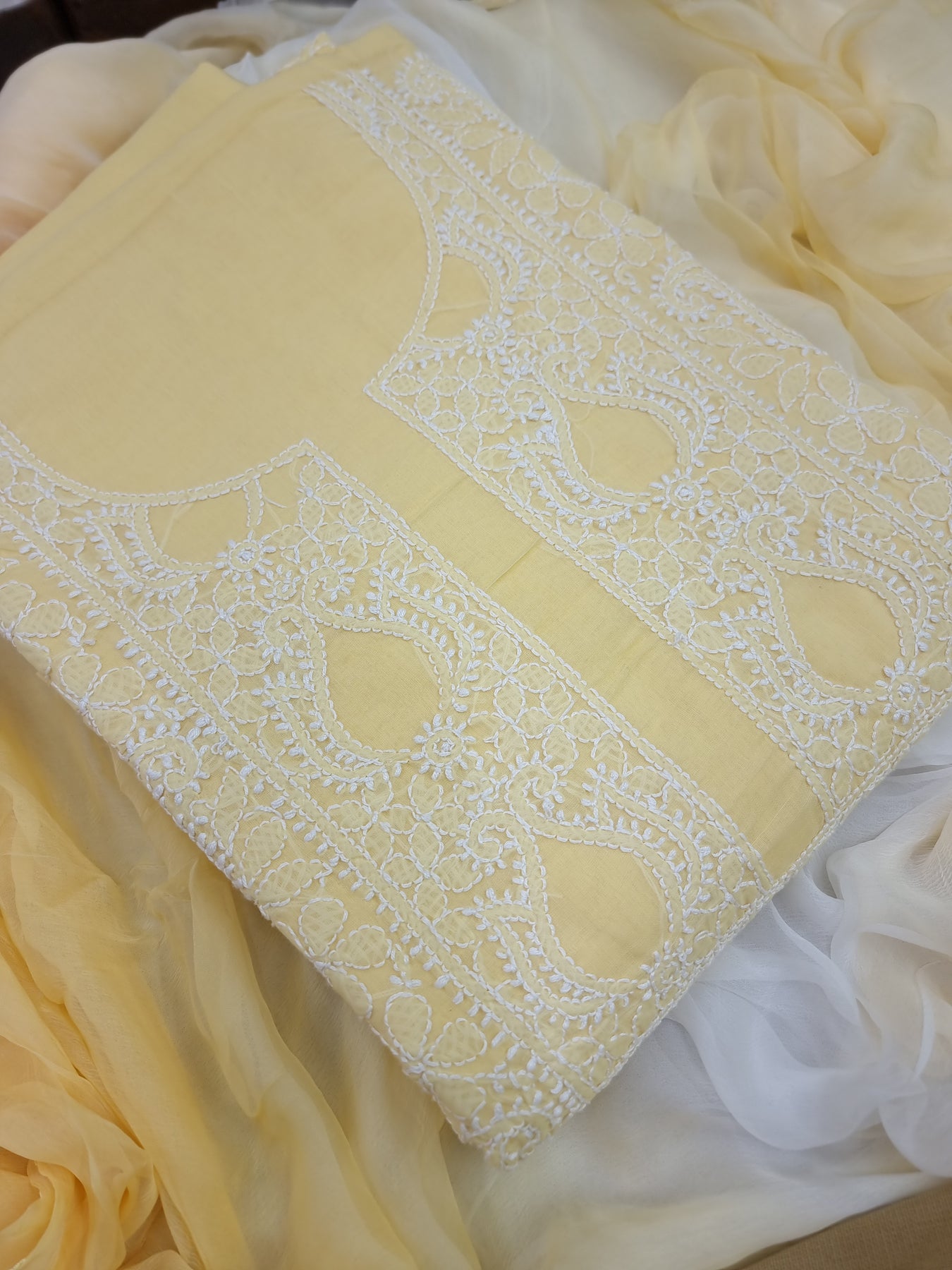 "Pastel Yellow Lucknowi Chikankari Unstitched Cotton Suit Set – Kurta, Bottom & Dupatta by Paridhan Chikan"
